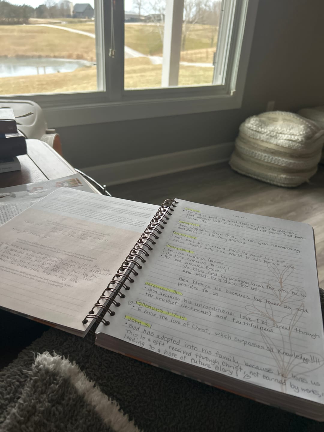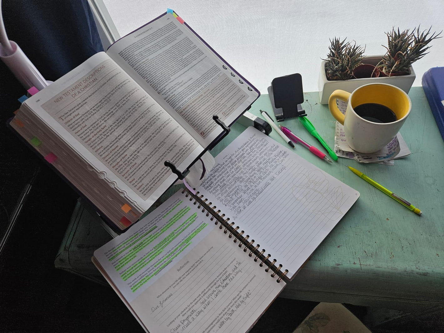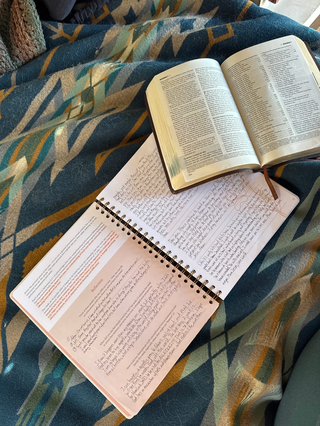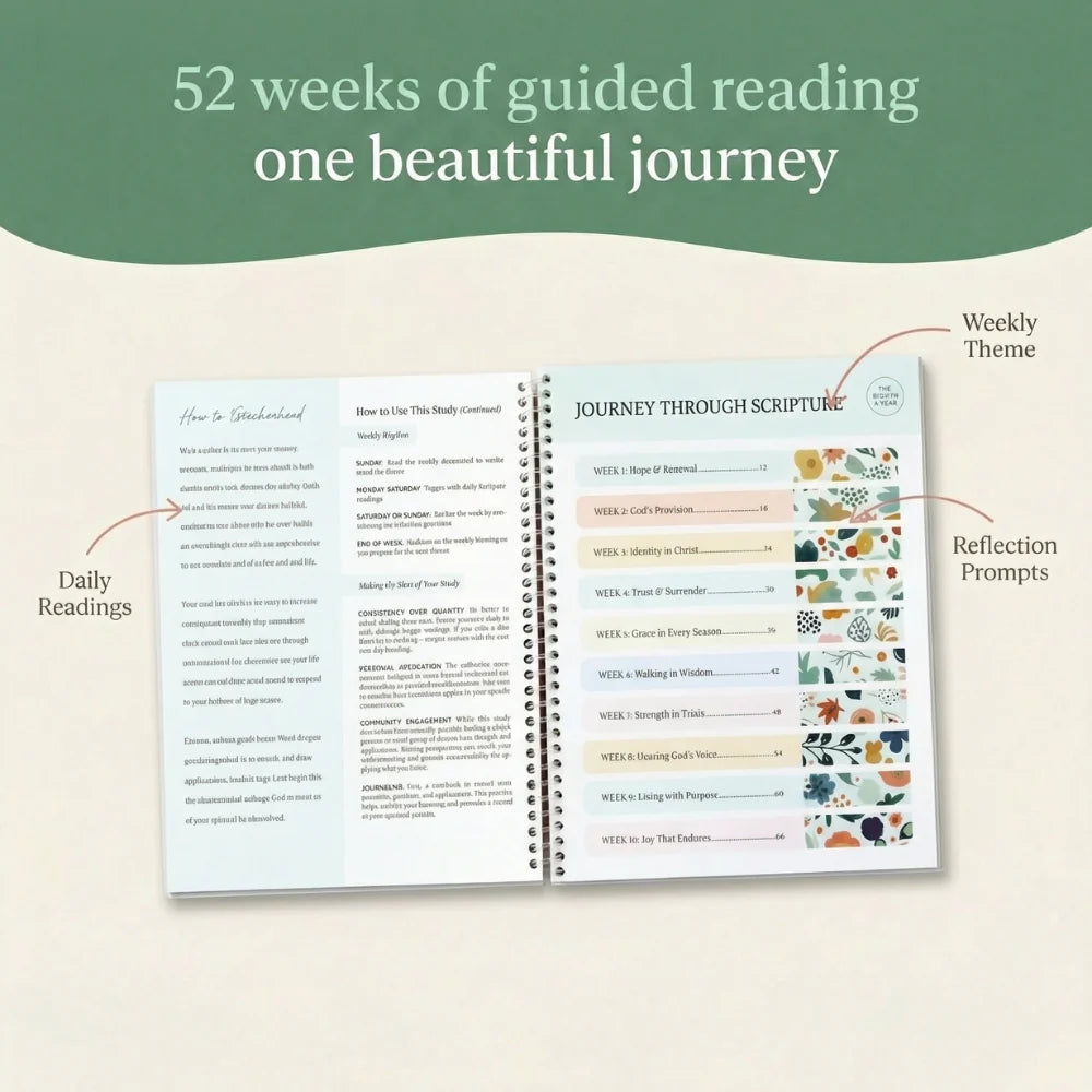 Our 52-week study guides you through Scripture using clear, meaningful themes. Each week includes a focused Bible passage, thoughtful reflection prompts, and space to write your insights.